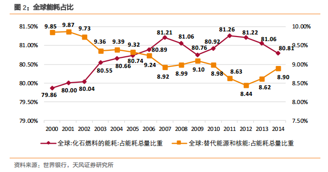 在能源消耗結(jié)構(gòu)來(lái)看,化石燃料能耗占比在2000年前不斷增加,而從2011年的81.26%開(kāi)始下降,至2014年減少到了80.81%;相對(duì)而言,替代能源和核能的占比則在這四年間也從8.44%一路穩(wěn)步增加至8.90%。雖然增減幅度還較小,但從中可見(jiàn)清潔化趨勢(shì)在逐漸加強(qiáng)。