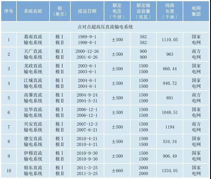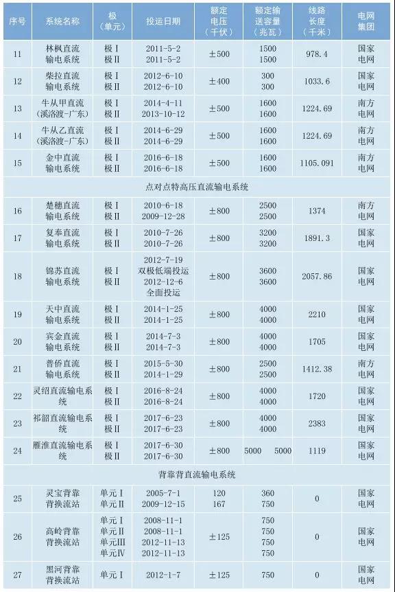 2017年在運(yùn)直流輸電系統(tǒng)基本情況