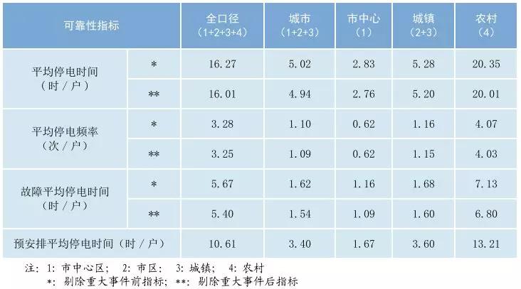 2017年全國平均供電可靠率為99.814%,同比上升了0.009個(gè)百分點(diǎn);用戶平均停電時(shí)間16.27小時(shí)/戶,同比減少了0.84小時(shí)/戶,用戶平均停電頻率3.28次/戶,同比減少了0.29次/戶。