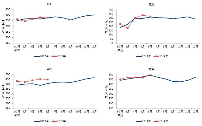 6月份,四大高載能行業(yè)用電量合計(jì)1636億千瓦時(shí),同比增長4.0%,占全社會(huì)用電量的比重為28.9%。其中,化工行業(yè)用電量376億千瓦時(shí),同比增長2.5%;建材行業(yè)用電量319億千瓦時(shí),同比增長3.6%;黑色金屬行業(yè)用電量447億千瓦時(shí),同比增長10.4%;有色金屬冶煉行業(yè)494億千瓦時(shí),同比增長0.2%。