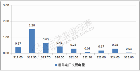 以冀北地區(qū)交易為例:2017年8月區(qū)外11家發(fā)電企業(yè)參與交易,成交均價(jià)為318.98元/千千瓦時(shí) ,成交價(jià)最高為325.00元/千千瓦時(shí),成交價(jià)最低為317.00元/千千瓦時(shí)。區(qū)外電廠成交電量電價(jià)區(qū)間如下: