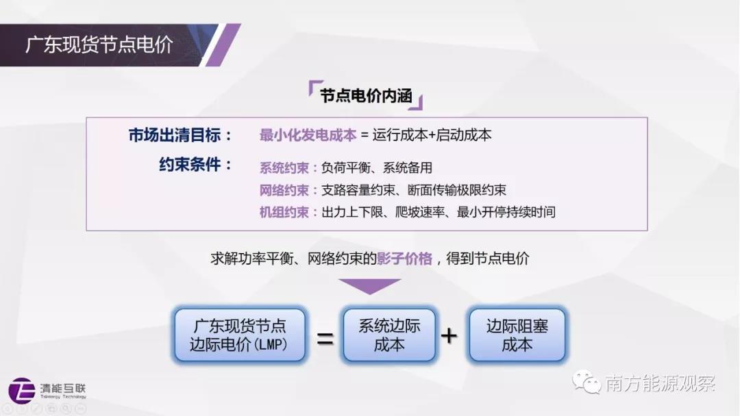 南方(以廣東起步)現(xiàn)貨市場的節(jié)點電價將由系統(tǒng)電能價格和阻塞價格構(gòu)成。系統(tǒng)電能價格反映全市場的電力供需情況,阻塞價格反映節(jié)點所在位置的電網(wǎng)阻塞情況。當網(wǎng)絡傳輸出現(xiàn)阻塞時,市場將會“拆分”為多個分區(qū),使得不同地理位置的邊際價格產(chǎn)生差異,偏離“無網(wǎng)絡約束”狀態(tài)下的邊際機組申報價格。節(jié)點電價的內(nèi)在機理非常復雜,一般而言,負荷大小和分布、發(fā)電側(cè)報價、發(fā)電機組物理參數(shù)、網(wǎng)絡傳輸能力是影響節(jié)點電價的主要因素。因此,市場主體在參與現(xiàn)貨市場申報時,需要結(jié)合市場運營機構(gòu)公布的運行信息進行分析決策。