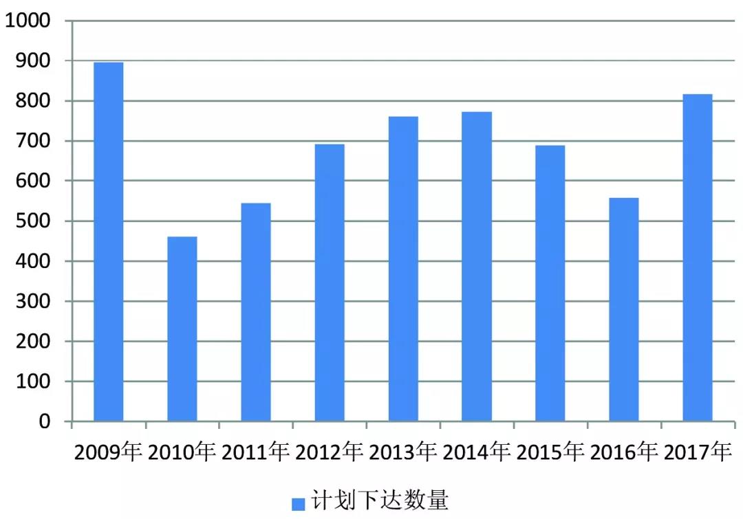 注:從能源領(lǐng)域行業(yè)標(biāo)準(zhǔn)計(jì)劃項(xiàng)目(除核電)下達(dá)數(shù)量年度統(tǒng)計(jì)(圖1)來(lái)看,每年計(jì)劃項(xiàng)目數(shù)量都較大,且波動(dòng)較大。