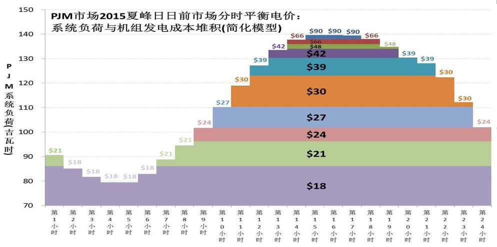 圖4 美國(guó)PJM市場(chǎng)2015年夏峰日日前市場(chǎng)分時(shí)電價(jià)及發(fā)電成本堆積圖
