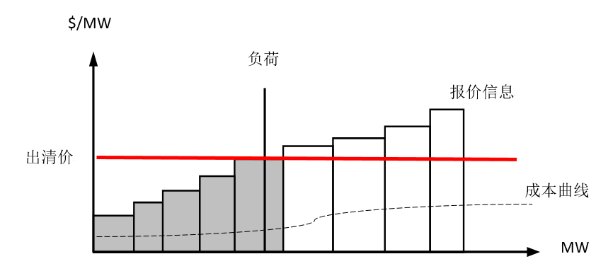 圖2用更簡(jiǎn)潔的方式圖示了單邊現(xiàn)貨競(jìng)價(jià)的過(guò)程,假設(shè)發(fā)電機(jī)組申報(bào)的是階梯狀的報(bào)價(jià)曲線,則ISO按報(bào)價(jià)由低到高對(duì)發(fā)電機(jī)組申報(bào)的容量(電量)段進(jìn)行排隊(duì),直至發(fā)電機(jī)組總出力能夠滿足系統(tǒng)負(fù)荷,圖中陰影部分機(jī)組中標(biāo),而報(bào)價(jià)最高的中標(biāo)機(jī)組確定市場(chǎng)價(jià)格,這種競(jìng)價(jià)出清用Excel表格處理就足夠了。