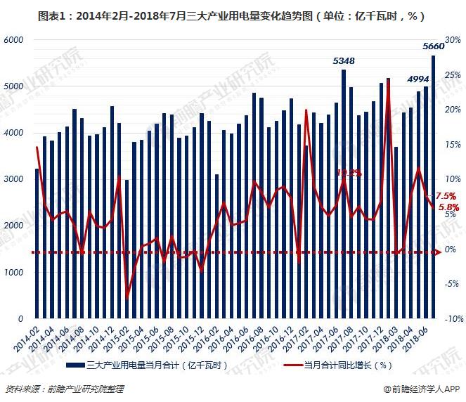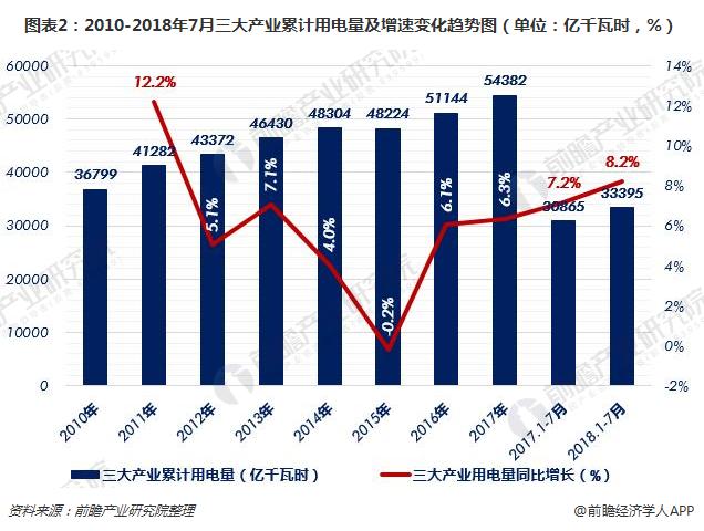 2018年1-7月份,三大產(chǎn)業(yè)累計(jì)用電量達(dá)到33395億千瓦時(shí)(2017年同期為30865億千瓦時(shí)),同比增長8.20%,增速比上年同期提高1個(gè)百分點(diǎn)。
