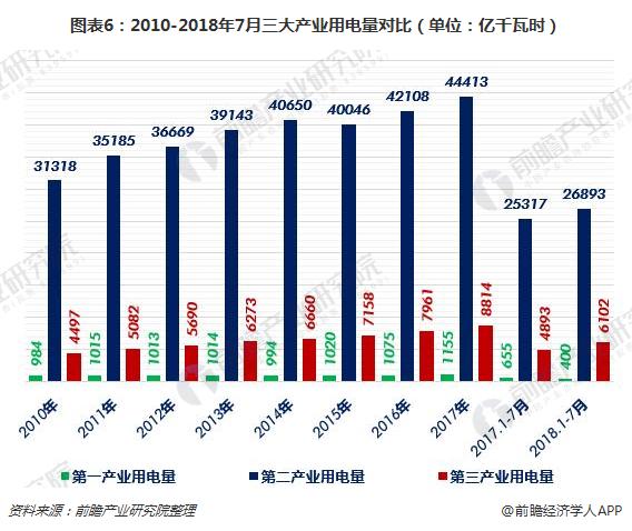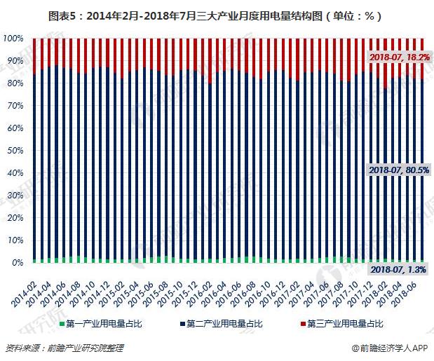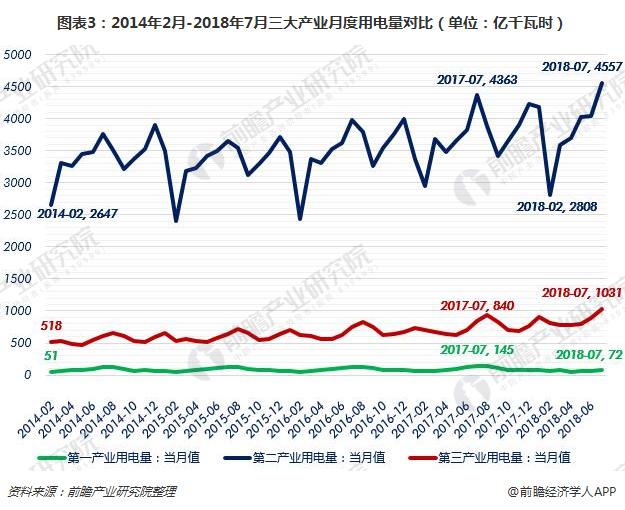 分產(chǎn)業(yè)看,2018年7月份,第一產(chǎn)業(yè)用電量72億千瓦時(shí)(上年同期為145億千瓦時(shí)),同比下滑50.3%;第二產(chǎn)業(yè)用電量4557億千瓦時(shí)(上年同期為4363億千瓦時(shí)),同比增長4.4%;第三產(chǎn)業(yè)用電量1031億千瓦時(shí)(上年同期為840億千瓦時(shí)),同比增長22.7%。