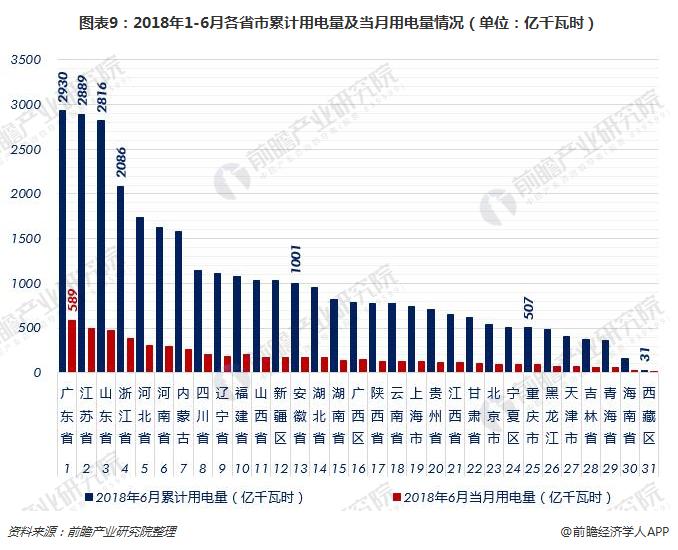 前瞻產(chǎn)業(yè)研究院最新監(jiān)測(cè)數(shù)據(jù)顯示,2018年1-6月各省市用電量最大的依然是廣東省。廣東省6月份的用電量為589億千瓦時(shí),2018年1-6月累計(jì)用電量為2930億千瓦時(shí)。此外,江蘇、山東和浙江的用電量也超過了2000億千瓦時(shí),分別為2889億千瓦時(shí)、2816億千瓦時(shí)、2086億千瓦時(shí)。西藏自治區(qū)上半年的用電量僅31億千瓦時(shí),排在末位。