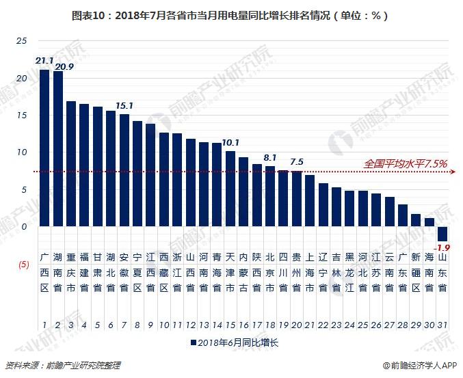 從當(dāng)月增速對(duì)比來看,6月份全社會(huì)用電量增速超過全國平均水平(7.5%)的省份有18個(gè),其中增速超過20%的省份有:廣西(21.1%)和湖南(20.9%);全社會(huì)用電量增速為負(fù)的省份為山東(-1.9%)。