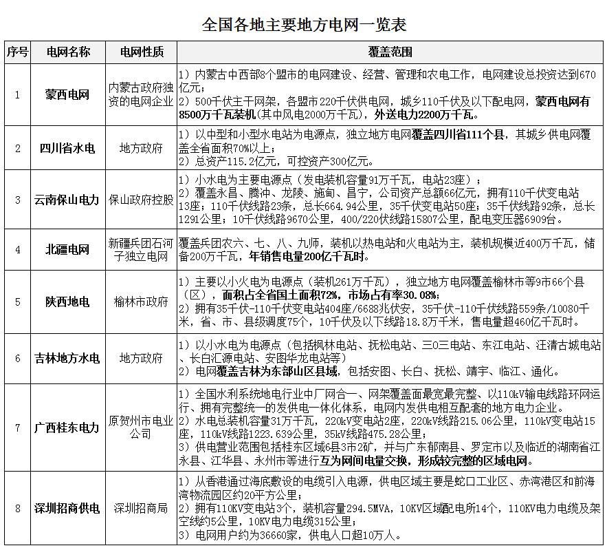 說起用電,很多人只知道供電局和用電,電怎么輸送到用戶中來的?估計還不少人還不是很明白,其實(shí)除了國家電網(wǎng)南方電網(wǎng)兩大電網(wǎng)外,還有一些地方獨(dú)立電網(wǎng)、一個省級電網(wǎng)(蒙西電網(wǎng))、13個地級市電網(wǎng)和近400個縣級電網(wǎng),一起承擔(dān)著電力輸送和用電管理工作。大云網(wǎng)sgcio.com分析師匯總了目前主要的地方獨(dú)立電網(wǎng),讓大家有一個了解: