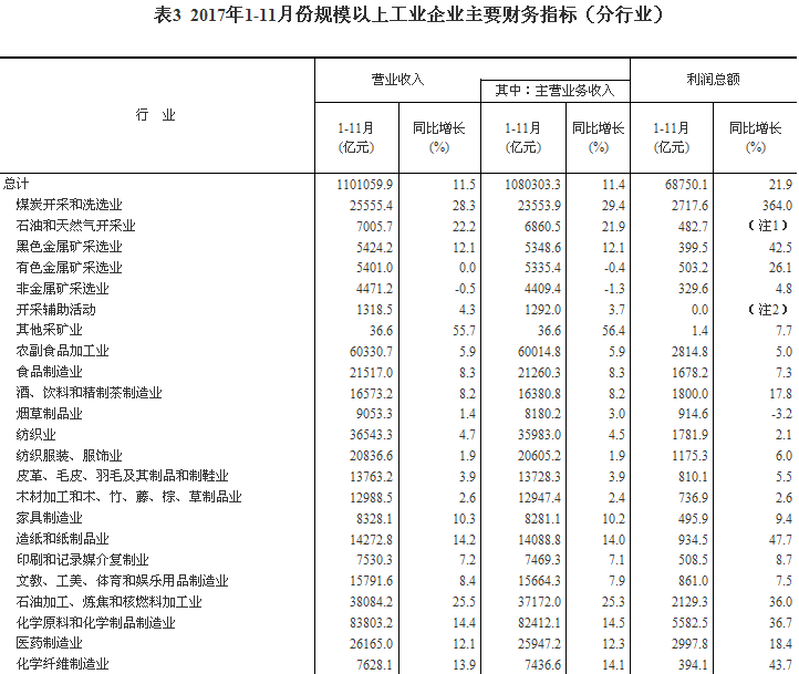 1-11月份,全國規(guī)模以上工業(yè)企業(yè)實現(xiàn)利潤總額68750.1億元,同比增長21.9%,增速比1-10月份放緩1.4個百分點(diǎn)。
