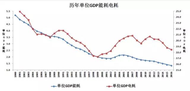 能源消費(fèi)總量增速趨緩是能源轉(zhuǎn)型的契機(jī)。我國(guó)經(jīng)濟(jì)發(fā)展階段正在向后工業(yè)化階段轉(zhuǎn)型,技術(shù)創(chuàng)新與進(jìn)步使各個(gè)行業(yè)的能源利用效率水平大幅度提高,具有資金密集型和能源高強(qiáng)度投入屬性的基礎(chǔ)材料業(yè)生產(chǎn)比重有所降低,全社會(huì)經(jīng)濟(jì)發(fā)展的質(zhì)量和能效在加快提高,經(jīng)濟(jì)發(fā)展對(duì)能源投入需求的依賴在減弱。改革開放以來(lái)四十年來(lái),燃煤電廠的能源轉(zhuǎn)換和電力輸送效率均提高了30%以上;全球金融危機(jī)后2010年以來(lái)的7年間,鋼鐵冶煉能效年均提高一個(gè)百分點(diǎn),水泥提高大致1.5個(gè)百分點(diǎn),公路運(yùn)輸以及新建建筑能效更是以年均1.8個(gè)百分點(diǎn)的幅度大踏步提高。全國(guó)歷年平均單位GDP能耗、電耗變化趨勢(shì)見圖1。