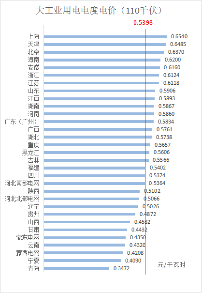 3、110千伏電壓等級(jí)下,全國(guó)平均電價(jià)約為0.5398元/千瓦時(shí),其中,上海最高為0.654元/千瓦時(shí),青海最低為0.3472元/千瓦時(shí)。