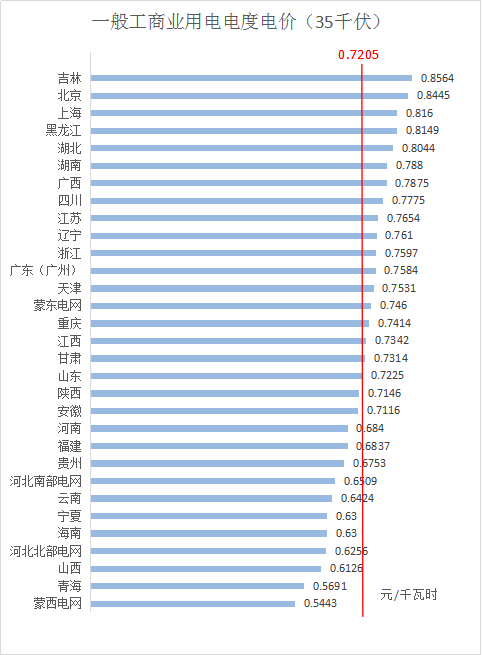 3、35千伏電壓等級(jí)下,全國(guó)平均電價(jià)約為0.7205元/千瓦時(shí),其中,吉林最高為0.8564元/千瓦時(shí),蒙西電網(wǎng)最低為0.5443元/千瓦時(shí)。