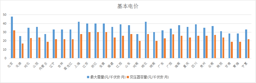 基本電價(jià)只有大工業(yè)用戶收取,分按最大需量和按變壓器容量收取。從基本電價(jià)的情況來(lái)看,按最大需量平均為35.1元/千瓦˙月,按變壓器容量平均約為24.4元/千瓦˙月,北京最高,天津最低。