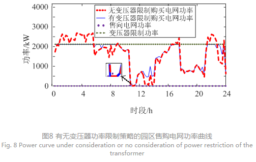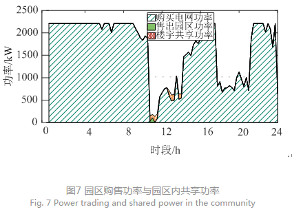 圖7表示園區(qū)與電網(wǎng)購售功率以及園區(qū)內(nèi)功率共享情況。11:00左右園區(qū)向外輸送功率,同時園區(qū)樓宇之間進行了功率共享,這是因為園區(qū)內(nèi)有樓宇把多余電能向外輸送,不僅滿足了其他樓宇的功率需求而且還有多余功率向園區(qū)外輸送。在13:00、14:00左右也有樓宇之間進行功率共享的情景。