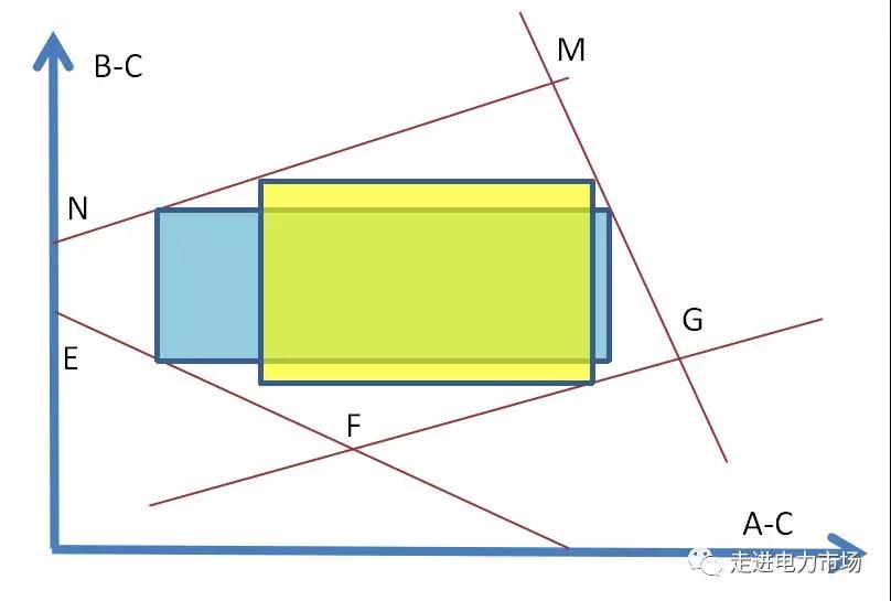 如圖1所示,假設系統(tǒng)中存在三個區(qū)域A、B和C,橫坐標表示AC兩個區(qū)域之間的交換功率,縱坐標表示BC兩個區(qū)域之間的交換功率。圖中四條紅色的線條表示系統(tǒng)中的一些線路造成的網絡約束。也就是說,考慮到電網的各種約束,AC、BC之間的傳輸功率必須進行一些協(xié)調,需要在紅色的線條圍起來的范圍之內,即五邊形EFGMN之內。如果想要讓AC之間的傳輸功率盡量大,應該運行在G點;如果想讓BC之間的傳輸功率盡量大,應該運行在M點。實際運行中,AC、BC的傳輸功率只要在EFGMN內,系統(tǒng)就是安全的、可行的。