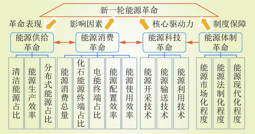 在全球面臨能源資源危機(jī)、氣候變化和環(huán)境污染等問題的背景下,世界各國開始探索以更加經(jīng)濟(jì)、高效、清潔的方式滿足經(jīng)濟(jì)社會發(fā)展需求的路徑,新舊能源系統(tǒng)逐步更迭過程催發(fā)了新一輪能源革命。這一過程將以優(yōu)化能源結(jié)構(gòu)、提高能源效率、促進(jìn)節(jié)能降耗、共享社會資源、實現(xiàn)可持續(xù)發(fā)展為目標(biāo),涵蓋能源開發(fā)、生產(chǎn)、加工、轉(zhuǎn)換、配置、消費和管理等各個環(huán)節(jié),涉及經(jīng)濟(jì)、社會、政治、文化、生態(tài)諸多方面,如圖1所示。清潔低碳是新一輪能源革命的主要方向,再電氣化是新一輪能源革命的重要特點,電能將在推動人類能源利用從以化石能源為主向以清潔能源為主的戰(zhàn)略轉(zhuǎn)型中發(fā)揮核心作用[14]。