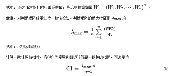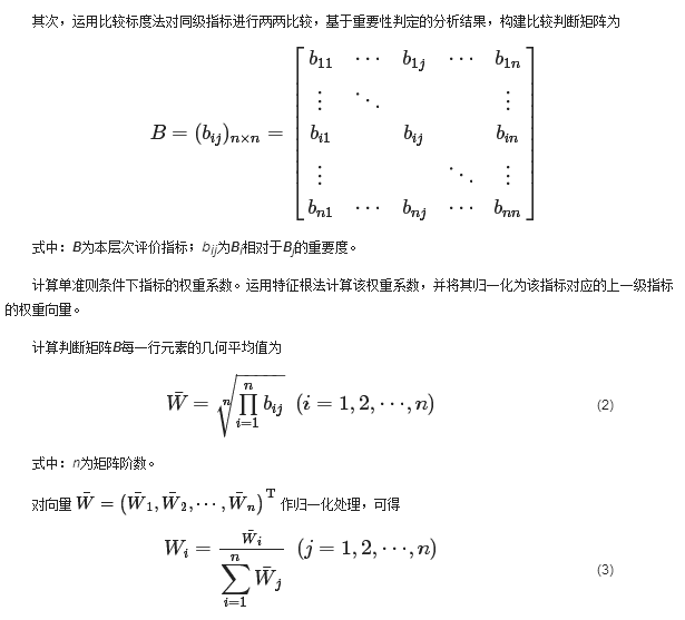 首先,為了保證權(quán)重計算的客觀準(zhǔn)確,在確定權(quán)重時需要對各要素的重要性進(jìn)行評判,運用1-9的比例標(biāo)度法作為依據(jù)給出分值,如表1所示。