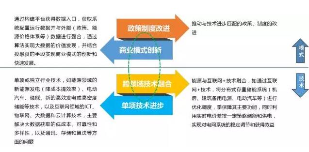 能源互聯(lián)網(wǎng)的發(fā)展動力分為技術(shù)和模式兩個層面的四個層次:首先是單向技術(shù)的進(jìn)步,包括光伏、風(fēng)電、儲能的經(jīng)濟(jì)性和能效的提升,以及互聯(lián)網(wǎng)領(lǐng)域ICT、物聯(lián)網(wǎng)、大數(shù)據(jù)和云計算技術(shù)的進(jìn)步等;然后是跨領(lǐng)域的技術(shù)融合,如能源與互聯(lián)網(wǎng)+的技術(shù)融合就可以將分布式存量儲能系統(tǒng)進(jìn)行優(yōu)化調(diào)調(diào)度,既保障其主要功能,同時利用實時電價差按照一定策略進(jìn)行儲能和供電,實現(xiàn)對電網(wǎng)的穩(wěn)定調(diào)節(jié)并獲得收益;另一個推動力是商業(yè)模式創(chuàng)新,對于產(chǎn)業(yè)集團(tuán)而言商業(yè)模式創(chuàng)新也十分關(guān)鍵,需要結(jié)合投融資手段實現(xiàn)商業(yè)模式的創(chuàng)新和快速發(fā)展;最后是政策制度改進(jìn),主要是推動與技術(shù)進(jìn)步匹配的政策、制度的改進(jìn)。