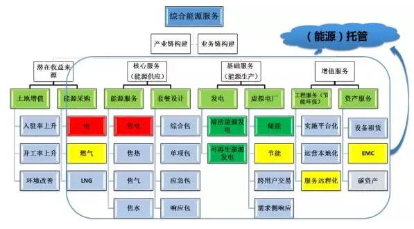 進(jìn)一步梳理區(qū)域能源互聯(lián)網(wǎng)業(yè)務(wù)模式,除構(gòu)建產(chǎn)業(yè)、業(yè)務(wù)鏈之外,針對具體的項目,可將其理想的盈利模式分解為四個方面:一是潛在的收益來源,包括土地增值和能源采購,這種模式主要應(yīng)用于園區(qū),土地增值方面,主要體現(xiàn)在入駐率上升、開工率上升和環(huán)境改善,而能源采購方面,主要體現(xiàn)在園區(qū)用能增加,電力、燃?xì)庖约癓NG的議價能力提高;二是核心服務(wù),包括綜合能源服務(wù)和套餐設(shè)計,能源服務(wù)方面,主要體現(xiàn)在集中售電、熱、水、氣等能源,節(jié)約成本,而套餐設(shè)計方面主要體現(xiàn)在綜合包、單項包、應(yīng)急包和響應(yīng)包;三是基礎(chǔ)服務(wù),即能源生產(chǎn),包括發(fā)電和虛擬電廠,發(fā)電方面主要體現(xiàn)在清潔能源發(fā)電和可再生能源發(fā)電,若自用電比例越高,收益越好,而虛擬電廠方面主要體現(xiàn)在儲能、節(jié)能、跨用戶交易和需求側(cè)響應(yīng);四是增值服務(wù),包括工程服務(wù)和資產(chǎn)服務(wù),工程服務(wù)方面主要體現(xiàn)在實施平臺化和運(yùn)營本地化,而資產(chǎn)服務(wù)體現(xiàn)在設(shè)備租賃、EMC(合同能源管理)和碳資產(chǎn)。整個區(qū)域能源互聯(lián)網(wǎng)綜合能源服務(wù)可看作是一種能源托管模式。