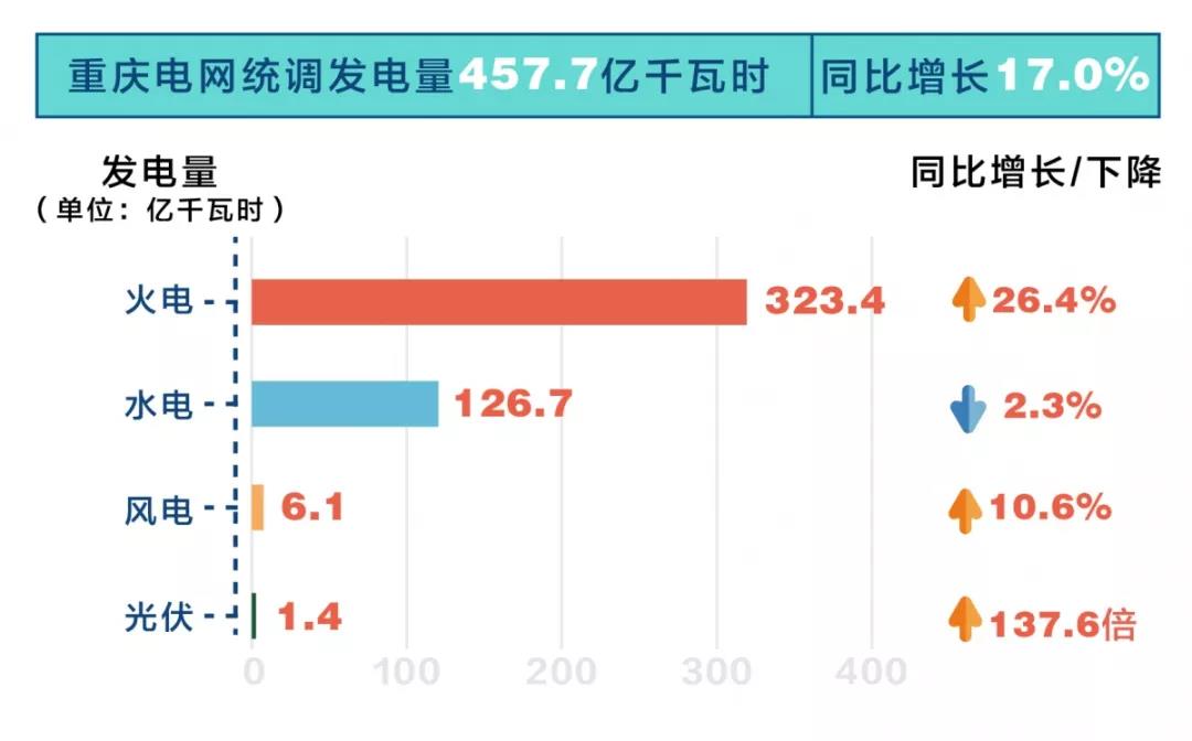1~9月,重慶電網(wǎng)統(tǒng)調(diào)發(fā)電量457.7億千瓦時(shí),同比增長(zhǎng)17.0%。其中:火電323.4億千瓦時(shí),同比增長(zhǎng)26.4%;水電126.7億千瓦時(shí),同比下降2.3%;風(fēng)電6.1億千瓦時(shí),同比增長(zhǎng)10.6%;光伏1.4億千瓦時(shí),同比增長(zhǎng)137.6倍。累計(jì)外購(gòu)電202.01億千瓦時(shí),同比增長(zhǎng)10.51%。