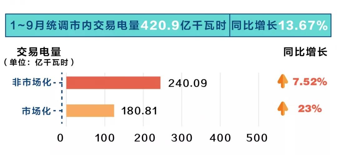 1~9月,完成統(tǒng)調(diào)市內(nèi)交易電量420.9億千瓦時(shí),同比增長(zhǎng)13.67%。其中:非市場(chǎng)化電量240.09億千瓦時(shí)(基數(shù)合同237.36億千瓦時(shí),調(diào)試0.06億千瓦時(shí),外送電量2.67億千瓦時(shí)),同比增長(zhǎng)7.52%;市場(chǎng)化電量180.81億千瓦時(shí)(大用戶31.79億千瓦時(shí),售電公司129.4億千瓦時(shí),市內(nèi)發(fā)電權(quán)11.45億千瓦時(shí),專項(xiàng)直供8.17億千瓦時(shí)),同比增長(zhǎng)23%。