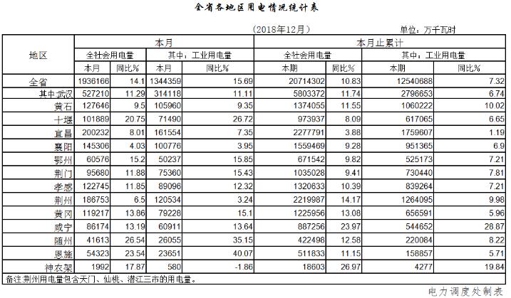 2018年,全省用電需求旺盛,全社會(huì)用電兩位數(shù)增長(zhǎng),增幅創(chuàng)近七年來最好水平,各大產(chǎn)業(yè)和城鄉(xiāng)居民生活用電全面增長(zhǎng)。全省電力戰(zhàn)線以習(xí)近平新時(shí)代中國(guó)特色社會(huì)主義思想為指引,認(rèn)真貫徹落實(shí)黨的十九大和習(xí)近平同志視察湖北重要講話精神,團(tuán)結(jié)協(xié)作,克難奮進(jìn),確保了全省電網(wǎng)安全穩(wěn)定運(yùn)行和電力正常供應(yīng),圓滿完成了各項(xiàng)政治及抗災(zāi)等保電任務(wù),為全省經(jīng)濟(jì)社會(huì)發(fā)展提供了堅(jiān)強(qiáng)的電力支撐。截止年底,全省全口徑裝機(jī)容量7401.05萬千瓦,同比增長(zhǎng)3.88%;全年發(fā)電量2851.06億千瓦時(shí),增長(zhǎng)7.77%;全社會(huì)用電量2071.43億千瓦時(shí),增長(zhǎng)10.83%,其中工業(yè)用電量1254.07億千瓦時(shí),增長(zhǎng)7.32%。