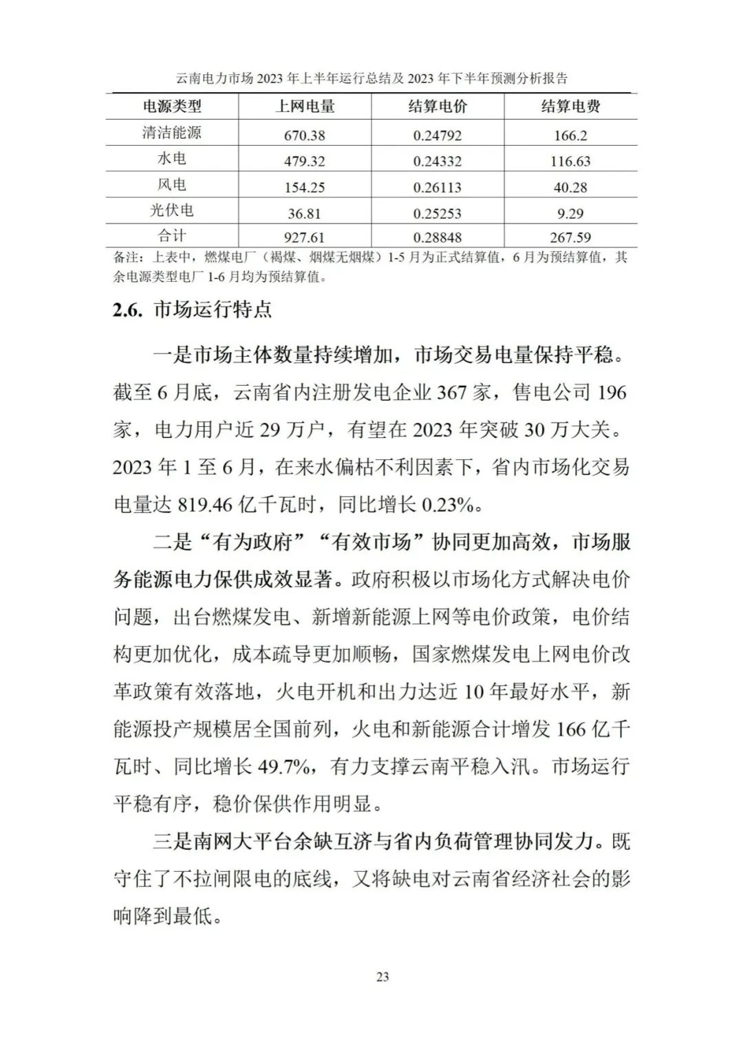 日前昆明電力交易中心發(fā)布云南電力市場2023年上半年運(yùn)行總結(jié)及2023年下半年預(yù)測分析報(bào)告。報(bào)告顯示:
