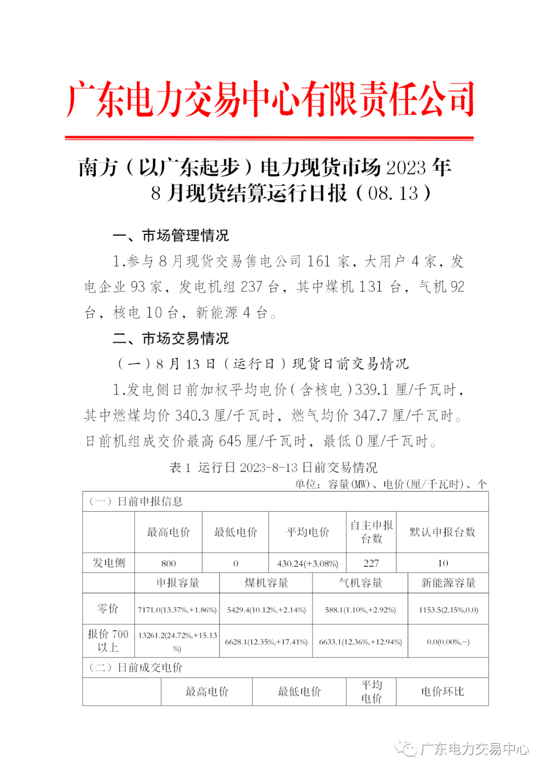 2023年8月13日南方(以廣東起步)電力現(xiàn)貨市場結(jié)算運行日報
