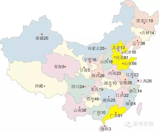 全國各省市具體情況:廣東91家,河北81家,山東66家,貴州46家,云南、遼寧分別38家,上海、安徽、陜西分別26家,內(nèi)蒙古、湖南分別25家,四川24家,河南23家,江蘇、江西分別22家,新疆20家,重慶、黑龍江分別19家,山西、寧夏分別16家,浙江、吉林分別14家,北京13家,天津、湖北分別10家,青海、甘肅分別5家,福建4家,海南3家。