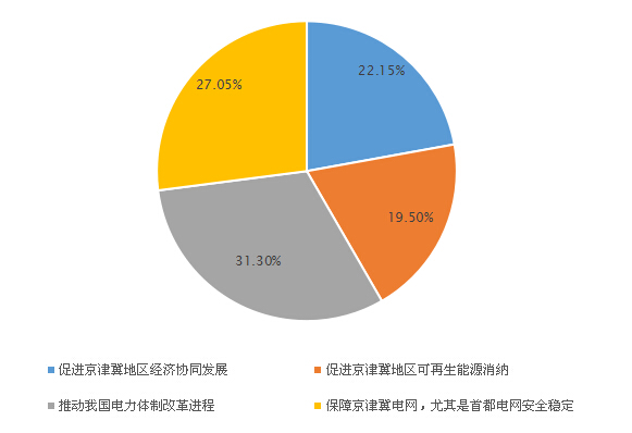 如圖1所示,31.30%的受訪者表示,京津冀區(qū)域電力直接交易將有效推動我國電力體制改革進程;27.05%的受訪者認為,此舉將進一步保障京津冀地區(qū)特別是首都電網(wǎng)的安全穩(wěn)定;22.15%的受訪者認為,此舉將對京津冀地區(qū)經(jīng)濟協(xié)同發(fā)展起到促進作用;19.50%的受訪者認為,此舉將對京津冀地區(qū)可再生能源消納有所促進。