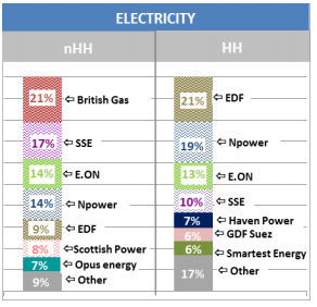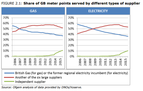 大約90%的英國(guó)居民還是那六家曾經(jīng)區(qū)域壟斷公司的客戶,當(dāng)然“蛋糕的分配”出現(xiàn)了變化。下圖是ofgem對(duì)于天然氣和電力客戶簽約情況的一個(gè)描述(來(lái)源[3])。