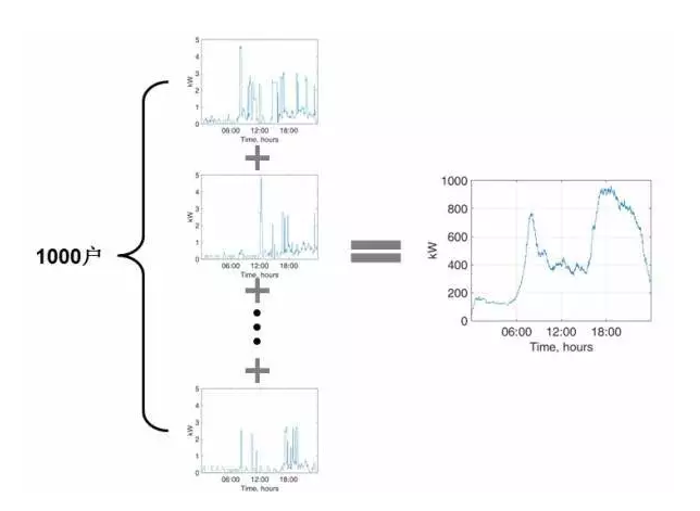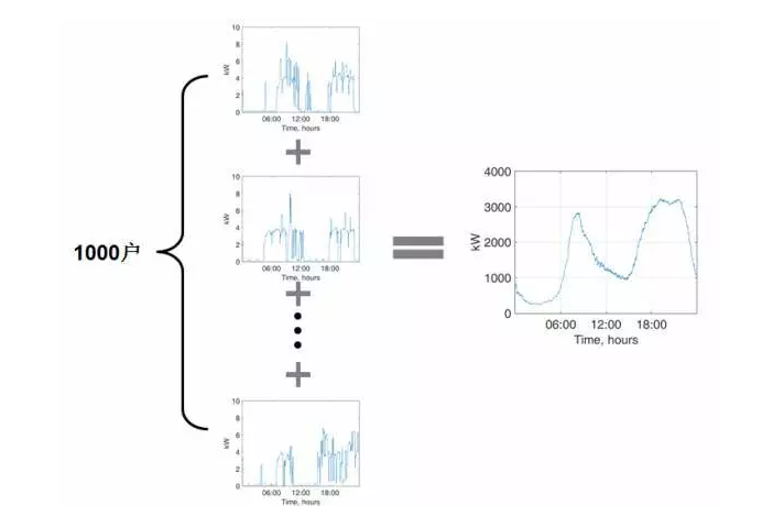 你可以嘗試再用另外1000個(gè)家庭的負(fù)荷疊加一次,差別跟上圖不會(huì)太大。這種現(xiàn)象就是由用戶用電習(xí)慣的隨機(jī)分布性所造成的。