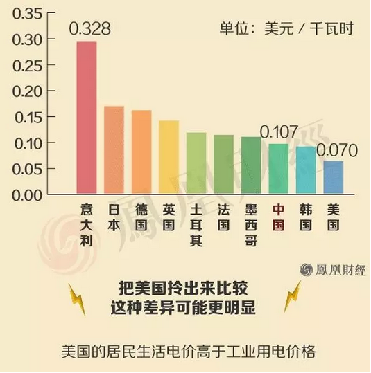 為什么企業(yè)家紛紛認(rèn)為中國(guó)的電價(jià)高?中國(guó)的電價(jià)高,高在哪?其實(shí)中國(guó)的居民電價(jià)不算特別高,工商業(yè)電價(jià)比較高。請(qǐng)看鳳凰財(cái)經(jīng)制作的圖表: