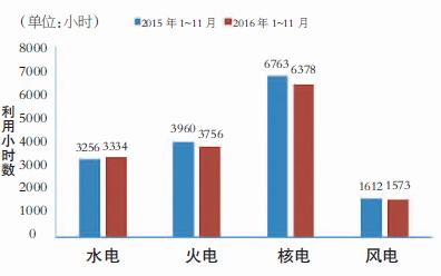2015年、2016年1~11月各類型電源發(fā)電利用小時(shí)數(shù)對(duì)比