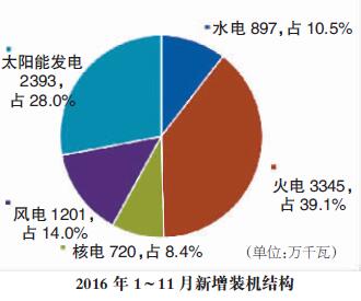 受煤電政策、環(huán)境約束等因素影響,2016年1~11月,全國新增裝機(jī)規(guī)模同比下降了5.4%,為8557萬千瓦。其中,火電新增裝機(jī)同比下降了30%,非化石能源新增裝機(jī)同比增長21%,比重進(jìn)一步提升至60.9%,創(chuàng)下歷史新高。預(yù)計(jì)全年新增裝機(jī)規(guī)模將達(dá)到1.3億千瓦,同比下降1.7%。其中,非化石能源新增裝機(jī)比重為61.1%。期末總裝機(jī)容量達(dá)到16.5億千瓦,同比增長8.5%,非化石能源裝機(jī)比重達(dá)到36.2%,較2015年提高了2.1個(gè)百分點(diǎn)。