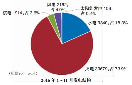 受電力需求回暖的帶動(dòng),2016年1~11月,全國發(fā)電量約5.4萬億千瓦時(shí),同比增長4.2%,增速較2015年同期提高了4.1個(gè)百分點(diǎn)。其中,火電發(fā)電量同比增長2.2%,增速同比提高4.6個(gè)百分點(diǎn)。風(fēng)電、核電發(fā)電量同比分別增長30.3%和20.5%,發(fā)電比重分別達(dá)到4%、3.6%。