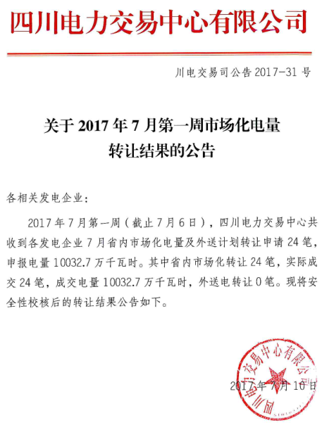 四川電力交易中心日前發(fā)布了2017年7月第一周、第二周市場(chǎng)化電量轉(zhuǎn)讓結(jié)果公告,前兩周已成交電量30686.6萬(wàn)千瓦時(shí)。