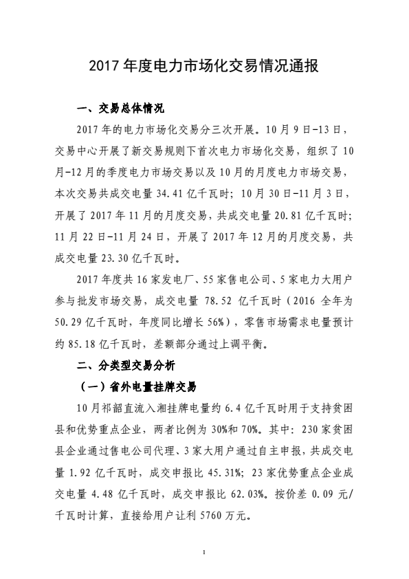 湖南2017年度電力市場化交易情況通報(bào):成交電量78.52億千瓦時(shí)