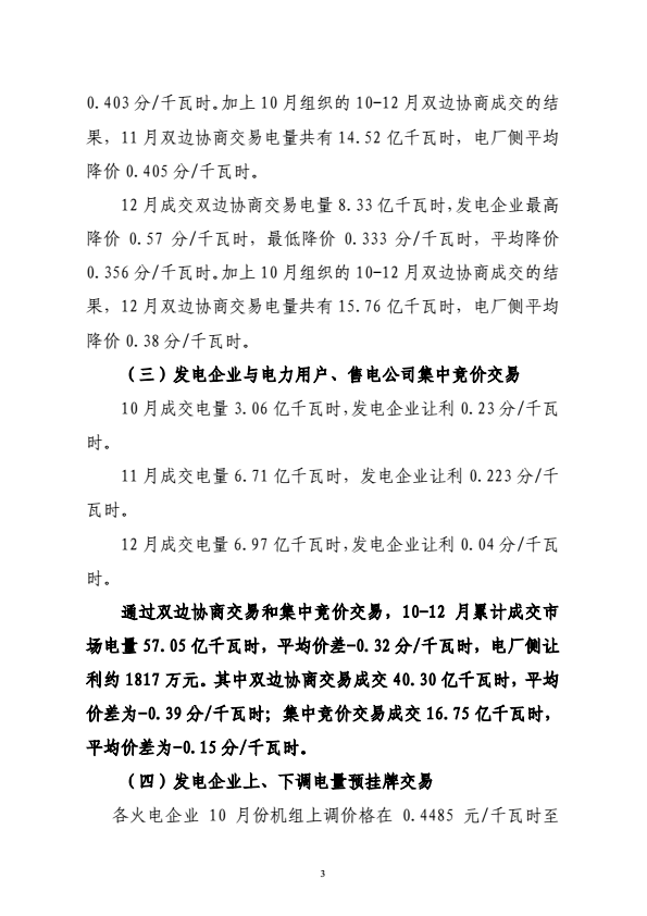 通過雙邊協(xié)商交易和集中競價(jià)交易,10-12月累計(jì)成交市場電量57.05億千瓦時(shí);集中競價(jià)交易成交16.75億千瓦時(shí)。原文如下: