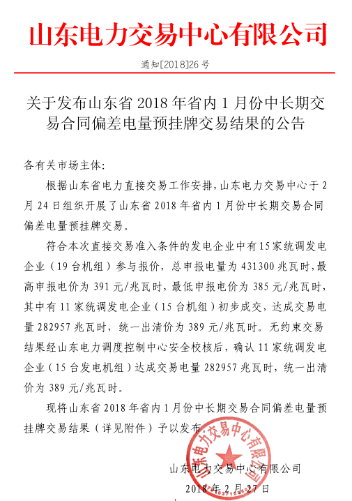 山東2018年省內(nèi)1月中長期交易合同偏差電量預(yù)掛牌交易結(jié)果:交易電量282957兆瓦時