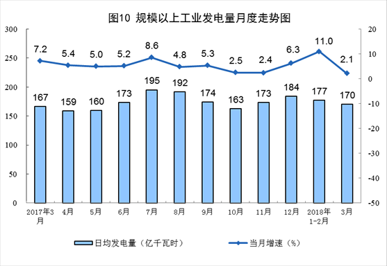 ?一季度發(fā)電1.6萬(wàn)億千瓦時(shí),發(fā)電量快速增長(zhǎng),同比增長(zhǎng)8.0%,增速比去年同期加快1.3個(gè)百分點(diǎn)。3月份,全國(guó)平均氣溫較常年同期偏高2.9℃,而去年同期氣溫接近常年,且本月較去年同期少1個(gè)工作日,受此影響,發(fā)電量增速有所回落,同比增長(zhǎng)2.1%。