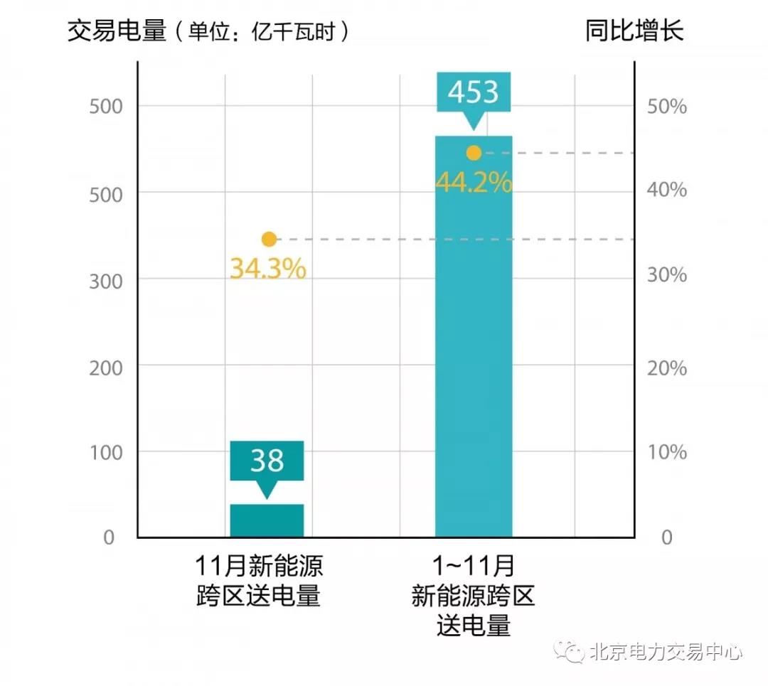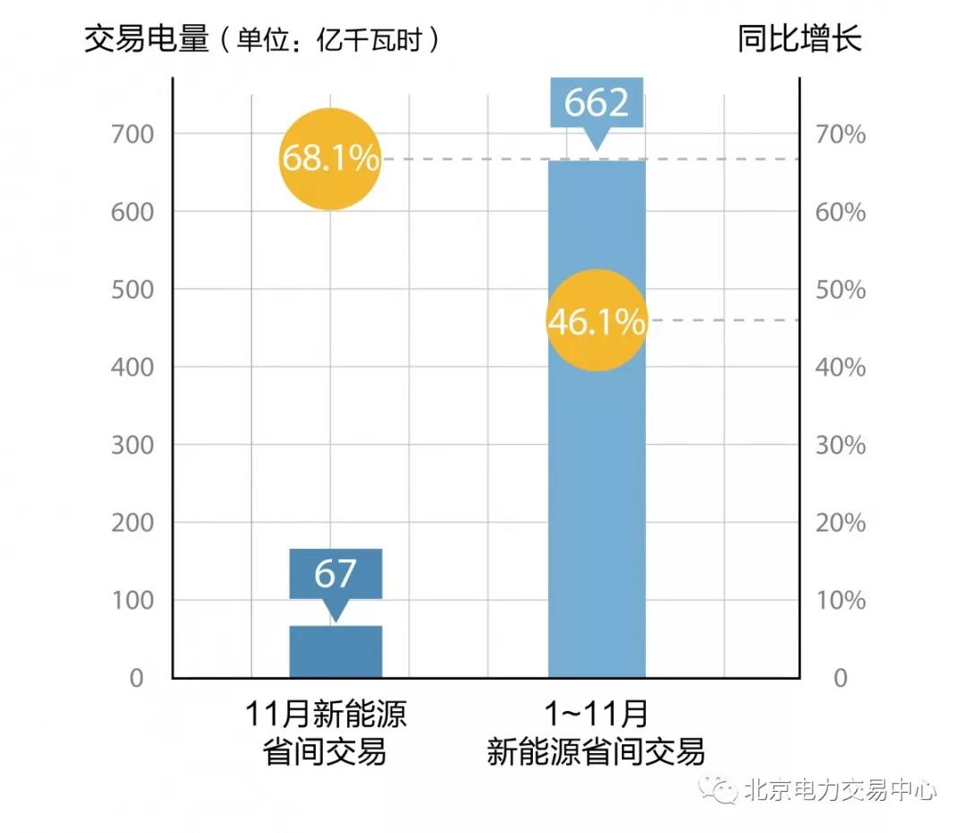 2018年11月,北京電力交易中心組織開展的新能源省間交易完成交易電量67億千瓦時,同比增長68.1%。截至11月底,新能源省間交易累計完成電量662億千瓦時,同比增長46.1%。