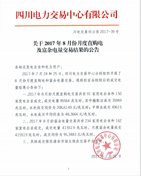 從四川電力交易中心獲悉,2017年7月24日和25日,四川電力交易中心分別組織開(kāi)展了8月份月度直購(gòu)電和富余電量交易。共有91家用電企業(yè)和150家發(fā)電企業(yè)成交,成交電量85564兆瓦時(shí)。具體公告如下: