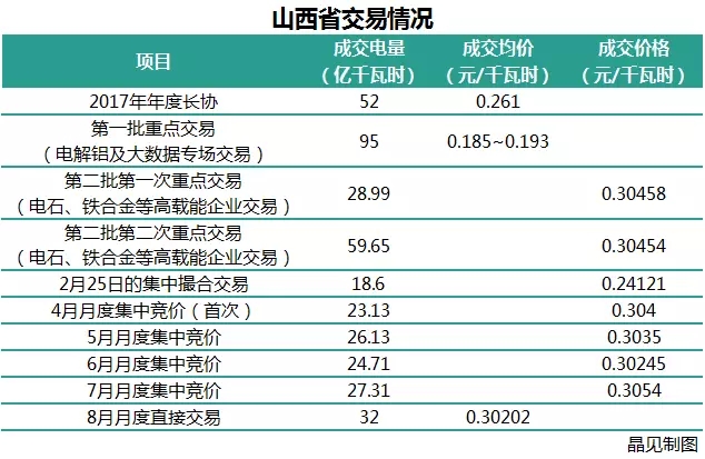 晶見(jiàn)工作室匯總了山西省2017年的10次交易結(jié)果供大家參考,根據(jù)山西的上半年的交易結(jié)果和處在發(fā)電壟斷案被推到風(fēng)口浪尖的時(shí)期進(jìn)行的8月份交易結(jié)果來(lái)看,成交價(jià)格似乎已經(jīng)固定在了0.302~0.306之間。繼續(xù)這種狀態(tài)的話(huà),成交價(jià)格再往下降幾乎不可能。