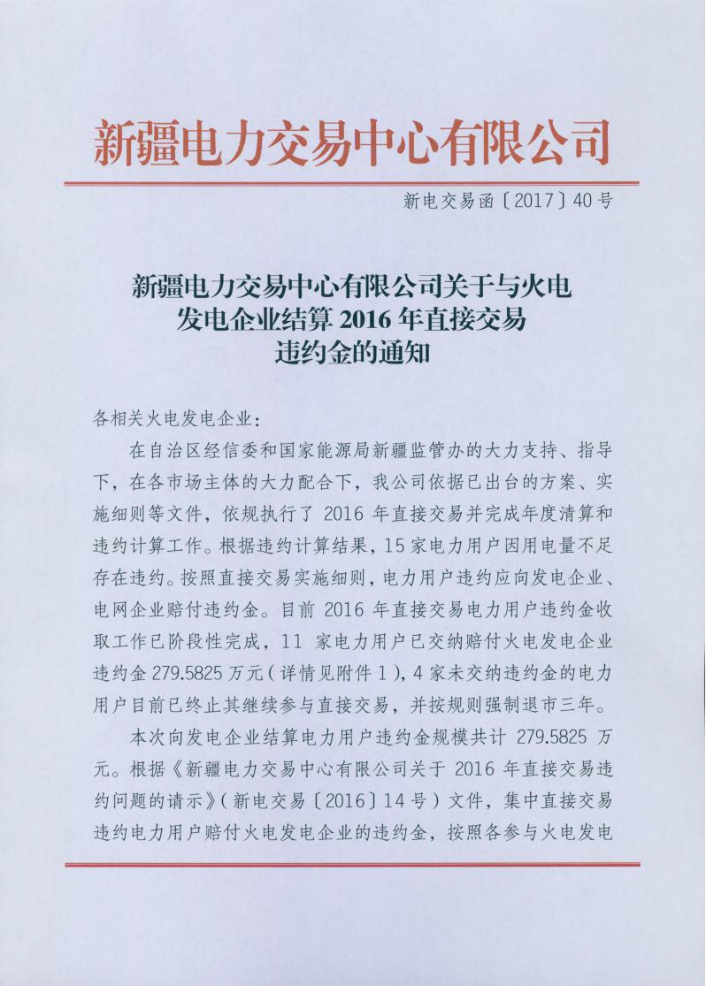 新疆電力交易中心有限公司關(guān)于與火電發(fā)電企業(yè)結(jié)算2016年直接交易違約金的通知