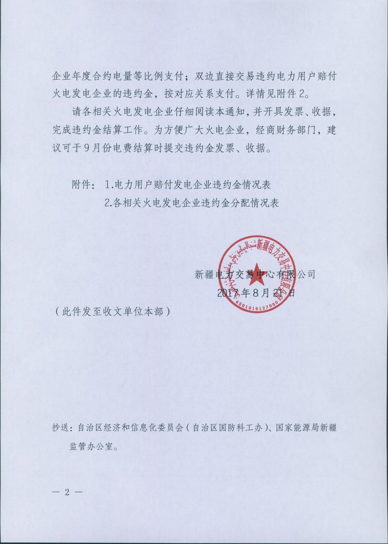 附件:新疆電力交易中心有限公司關(guān)于與火電發(fā)電企業(yè)結(jié)算2016年直接交易違約金的通知(正式文件)