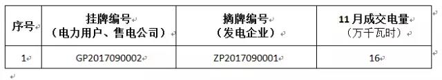 貴州關(guān)于2017年11月掛牌交易(電力用戶(hù)、售電公司掛牌)成交情況的公告:成交電量16萬(wàn)千瓦時(shí)