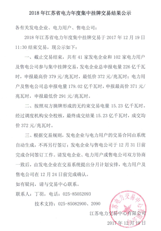 2018年江蘇省電力年度集中掛牌交易結(jié)果:成交電量15.23億千瓦時